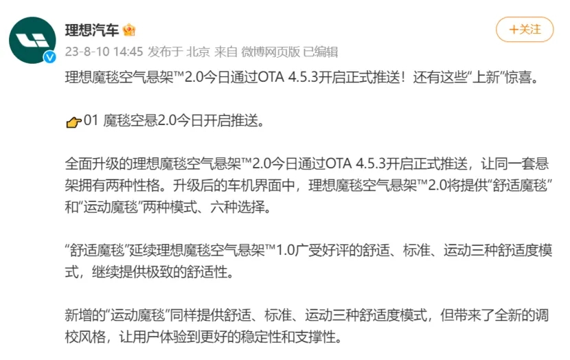 理想則于8月10日通過(guò)OTA將空氣懸掛玩出了新花樣,一套懸掛,帶給用戶不同的駕乘體驗(yàn)。