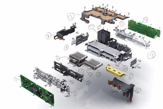(1)驅(qū)動(dòng)板,(2)驅(qū)動(dòng)板支架,(3)高壓母線采樣線束,(4)三相輸出疊層銅排,(5)三相銅排,(6)母線一體霍爾,(7)日立雙面水冷IGBT模塊,(8)疊層母排,(9)出水口蓋板,(10)IGBT冷卻水道,(11)母線電容,(12)正(或者負(fù))母排,不知道哪個(gè)是正負(fù),(13)進(jìn)水口蓋板,(14)控制板,(15)電容引腳焊接點(diǎn),(16)IGBT中間四引腳焊接點(diǎn),(17)IGBT粗引腳焊接處,(18)IGBT水道另一端蓋板。密封圈是橡膠硅膠材料嗎有毒嗎