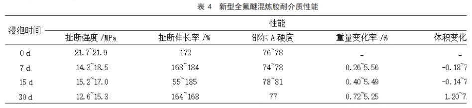 表3顯示,新研制的FFKM混煉膠在常溫拉伸強(qiáng)度與斷裂伸長率上優(yōu)于其他混煉膠,表明其力學(xué)性能突出。同時,高溫壓縮永久變形顯著降低,能在280℃下穩(wěn)定使用,展現(xiàn)出卓越的高溫性能。表4則證實(shí)了其優(yōu)異的耐介質(zhì)性能,達(dá)到一級相容標(biāo)準(zhǔn)。氟橡膠產(chǎn)品