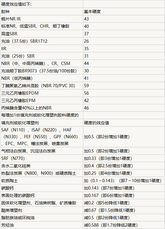 硬度估算值 = 橡膠基礎(chǔ)硬度 + 填料(或軟化油)用量 × 硬度效應(yīng)值(填料或軟化劑)
