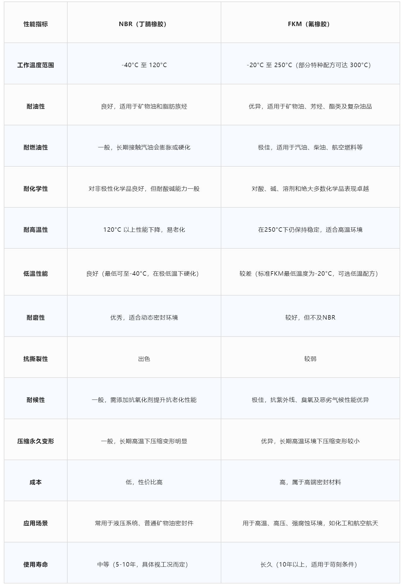 FKM:使用溫度范圍-20°C至250°C(部分可達300°C),高溫下保持柔韌性和密封性能。