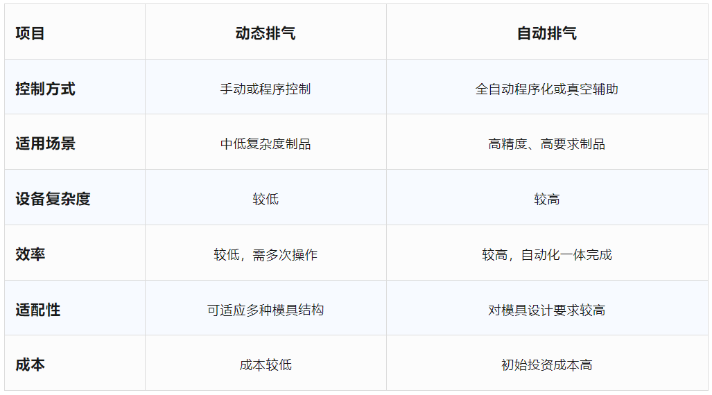 動態(tài)排氣:通過模具的反復(fù)開合,動態(tài)排氣能逐步排出模腔深處的氣體,尤其適用于復(fù)雜型腔或厚壁制品。排氣次數(shù)通常為2~4次,開合時間1~3秒,開模間隙0.5~2mm。