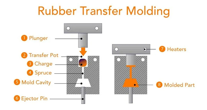 工藝步驟:橡膠料置于轉(zhuǎn)注室,經(jīng)由柱塞或活塞加壓擠入模腔,隨后硫化成型。
