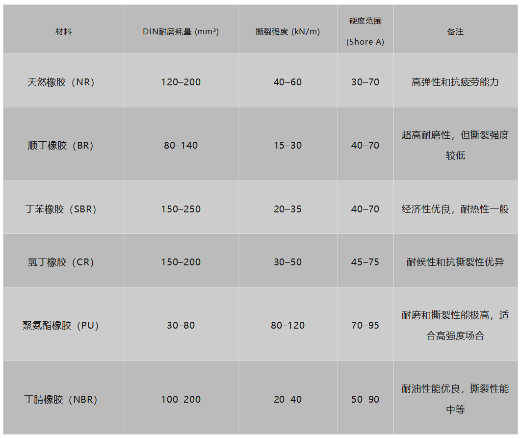 以下是幾種常用橡膠材料的耐磨性和撕裂性能數(shù)據(jù)對(duì)比: