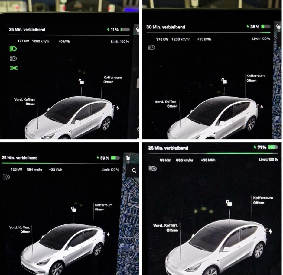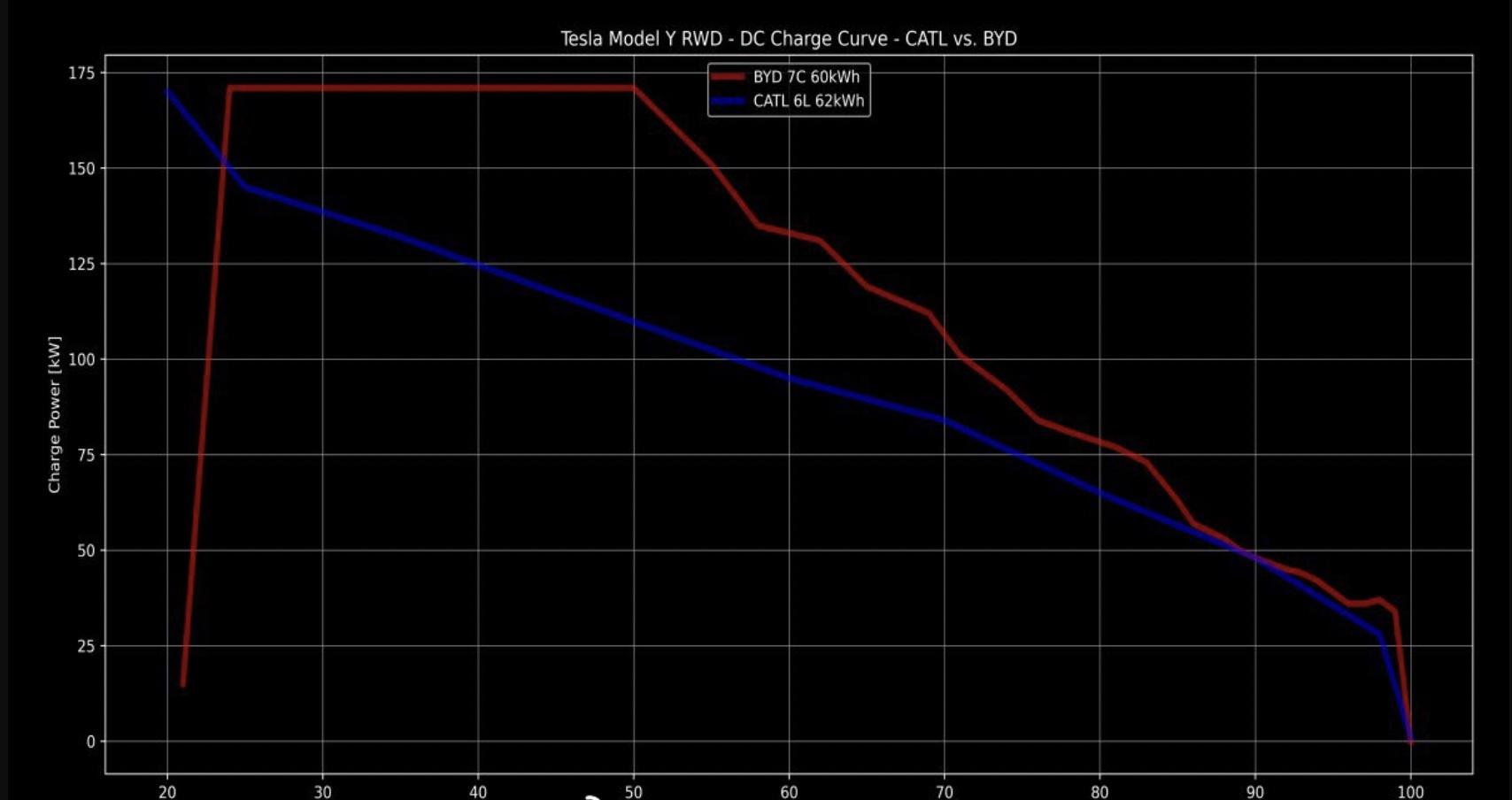 有用戶分享了這款車型的實測充電功率數(shù)據(jù),刀片電池版本的Model Y充電峰值功率達到170kW以上,15分鐘就能從11%充至71%。對比寧德時代版本,可以看到比亞迪版本的高功率充電時間維持的更長,充電功率也比較高。