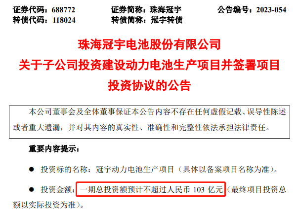 5月22日,珠海冠宇(688772.SH)也發(fā)布了大規(guī)模投建公告。珠海冠宇宣布,公司控股子公司浙江冠宇擬在四川省德陽市設(shè)立項(xiàng)目公司投資建設(shè)動力電池,一期總投資額不超過103億元,投產(chǎn)后產(chǎn)能達(dá)25GWh。力爭半年內(nèi)開工建設(shè),開工后42個(gè)月內(nèi)全部建成投產(chǎn)。