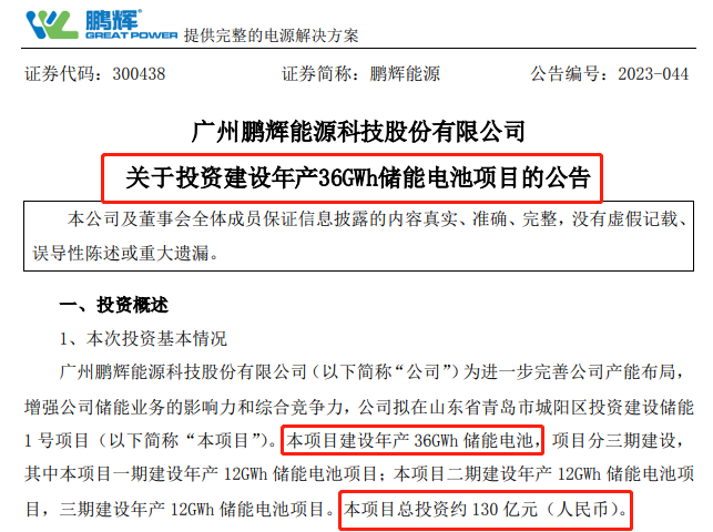 5月22日,鵬輝能源(300438.SZ)公告稱,公司擬在山東青島市城陽區(qū)投資建設(shè)儲能1號項(xiàng)目,項(xiàng)目建設(shè)年產(chǎn)36GWh儲能電池。該項(xiàng)目分三期建設(shè),每期建設(shè)年產(chǎn)12GWh儲能電池項(xiàng)目,項(xiàng)目總投資約130億元。項(xiàng)目一期計(jì)劃于今年9月底前開工建設(shè),于2024年12月底前建成投產(chǎn)。