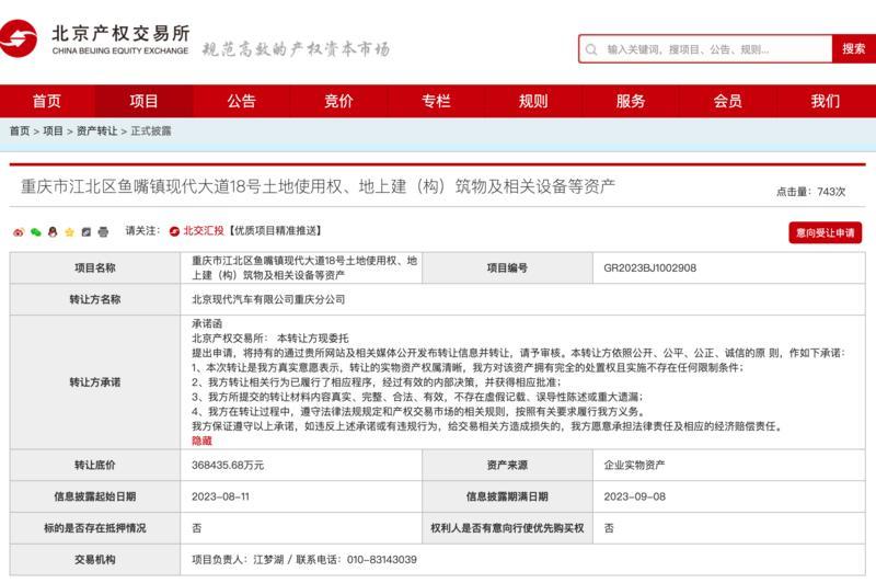 2023-08-24 14:08:59近日,一則名為“重慶市江北區(qū)魚嘴鎮(zhèn)現(xiàn)代大道18號土地使用權(quán)、地上建(構(gòu))筑物及相關(guān)設(shè)備等資產(chǎn)”的資產(chǎn)轉(zhuǎn)讓披露公告顯示,轉(zhuǎn)讓方為北京現(xiàn)代汽車有限公司重慶分公司,轉(zhuǎn)讓底價為36.84億元。要知道,當(dāng)年該工廠的總投資為77.5億元,這意味著北京現(xiàn)代重慶工廠五折掛牌出售。
