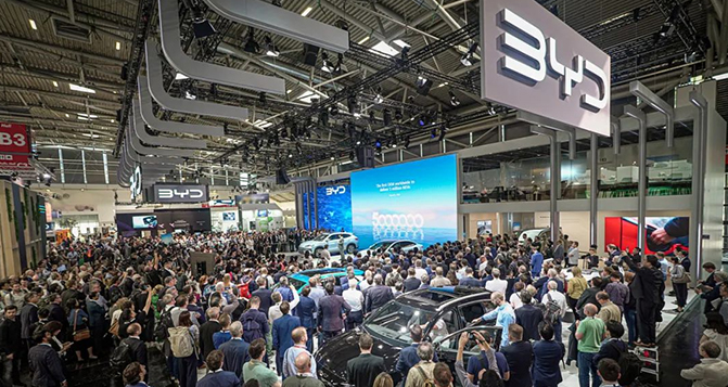 比亞迪攜海豹、宋PLUS EV冠軍版、元PLUS(海外命名為BYD ATTO 3)、海豚、漢以及騰勢D9亮相IAA。
